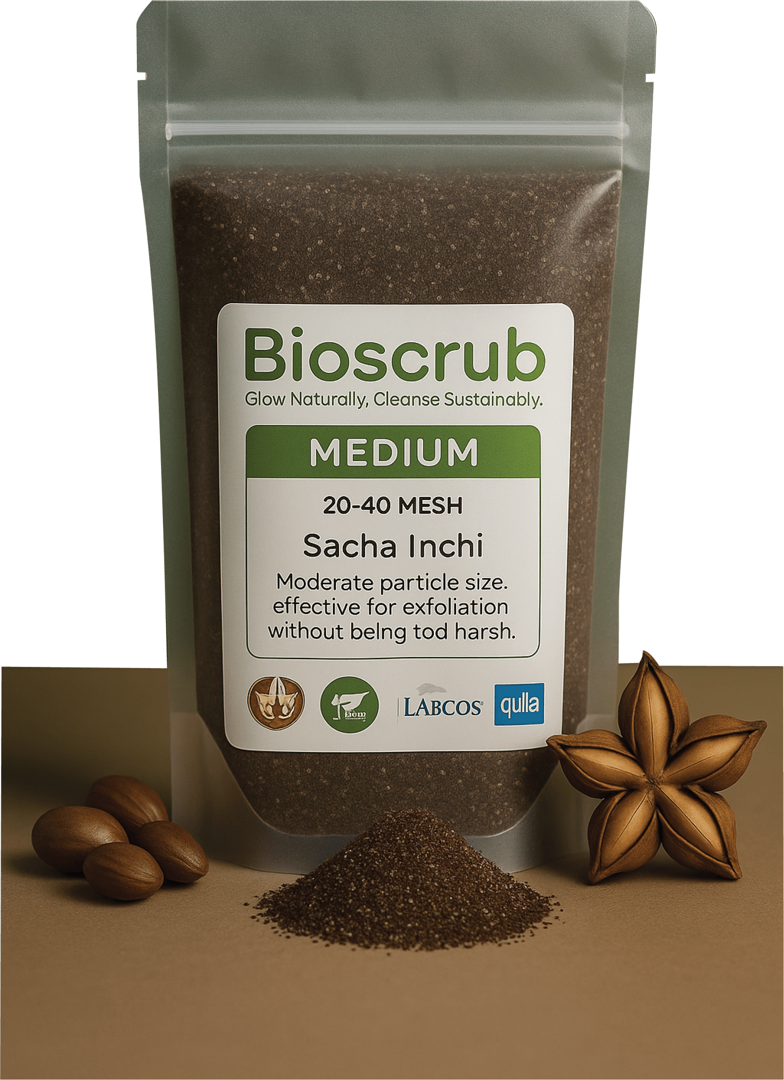 Secara fisik, partikel halus cangkang Sacha Inchi memiliki tekstur abrasif yang efektif untuk mengangkat sel kulit mati. Setelah melalui proses pengeringan dan penggilingan, cangkang dapat diubah menjadi bubuk dengan ukuran partikel terkontrol (umumnya ratusan mikrometer). Partikel cangkang bersifat keras namun relatif ringan, dan tepung cangkang ini tidak larut dalam air, sehingga cocok sebagai bahan eksfoliasi mekanik dalam sediaan kosmetik berbasis air maupun minyak. Warna bubuk cangkang Sacha Inchi biasanya cokelat muda hingga cokelat tua, yang dapat sedikit memengaruhi warna produk akhir. Dari segi kestabilan, butiran cangkang ini stabil pada berbagai pH formulasi dan tidak mudah terurai selama penyimpanan produk. Karakteristik tersebut serupa dengan bahan scrub alami lain seperti serbuk cangkang walnut (kenari) atau biji aprikot yang telah lama digunakan dalam kosmetik eksfoliasi.